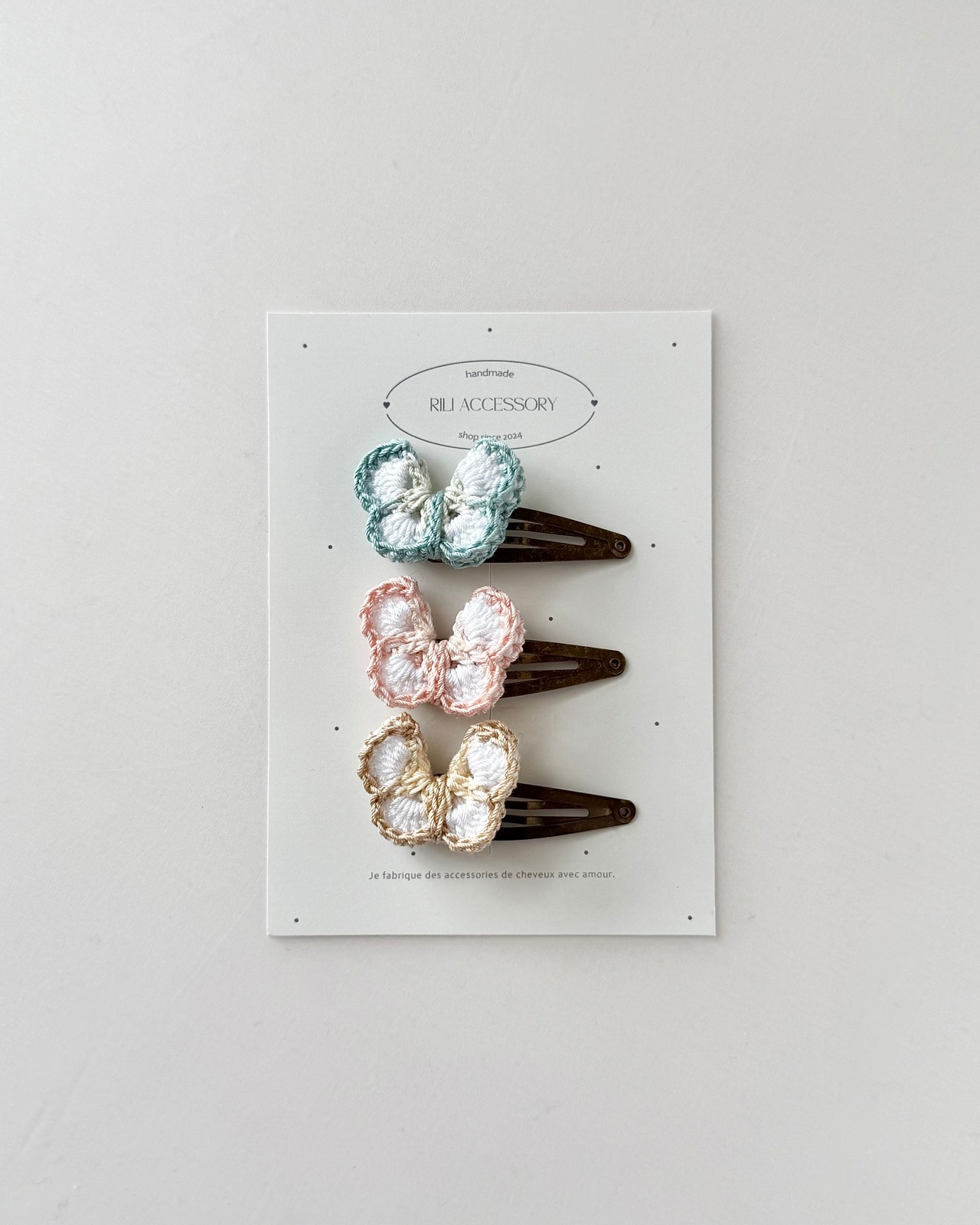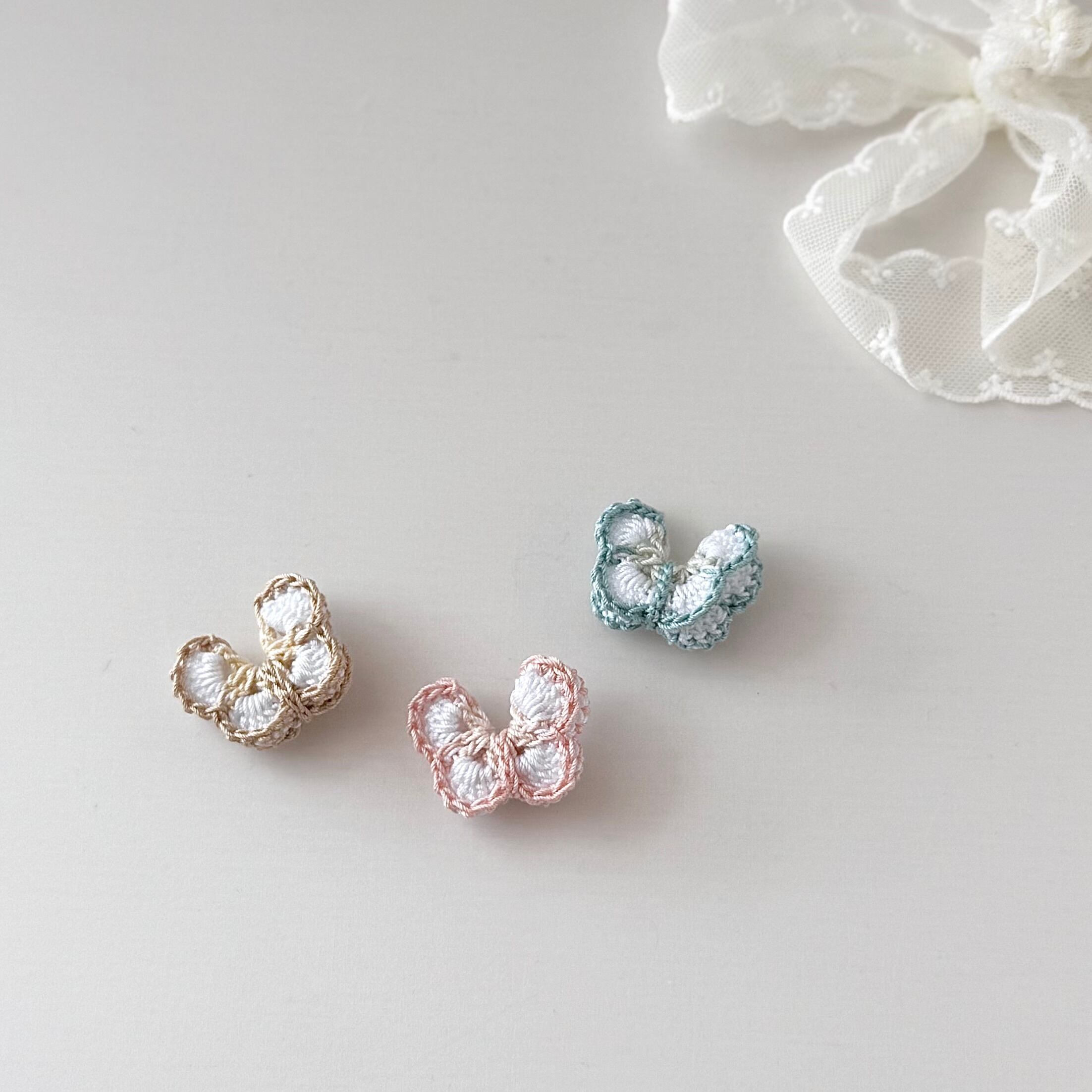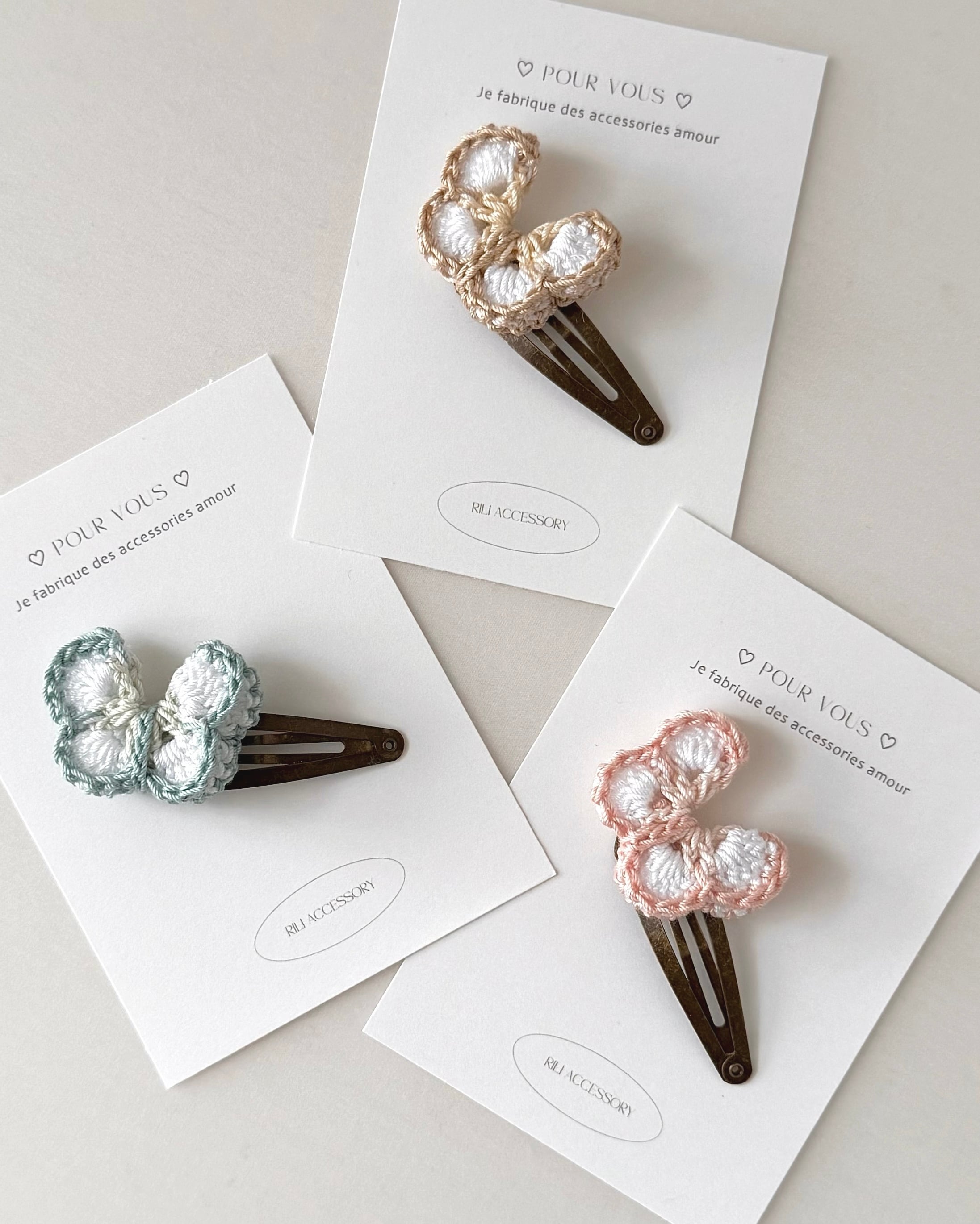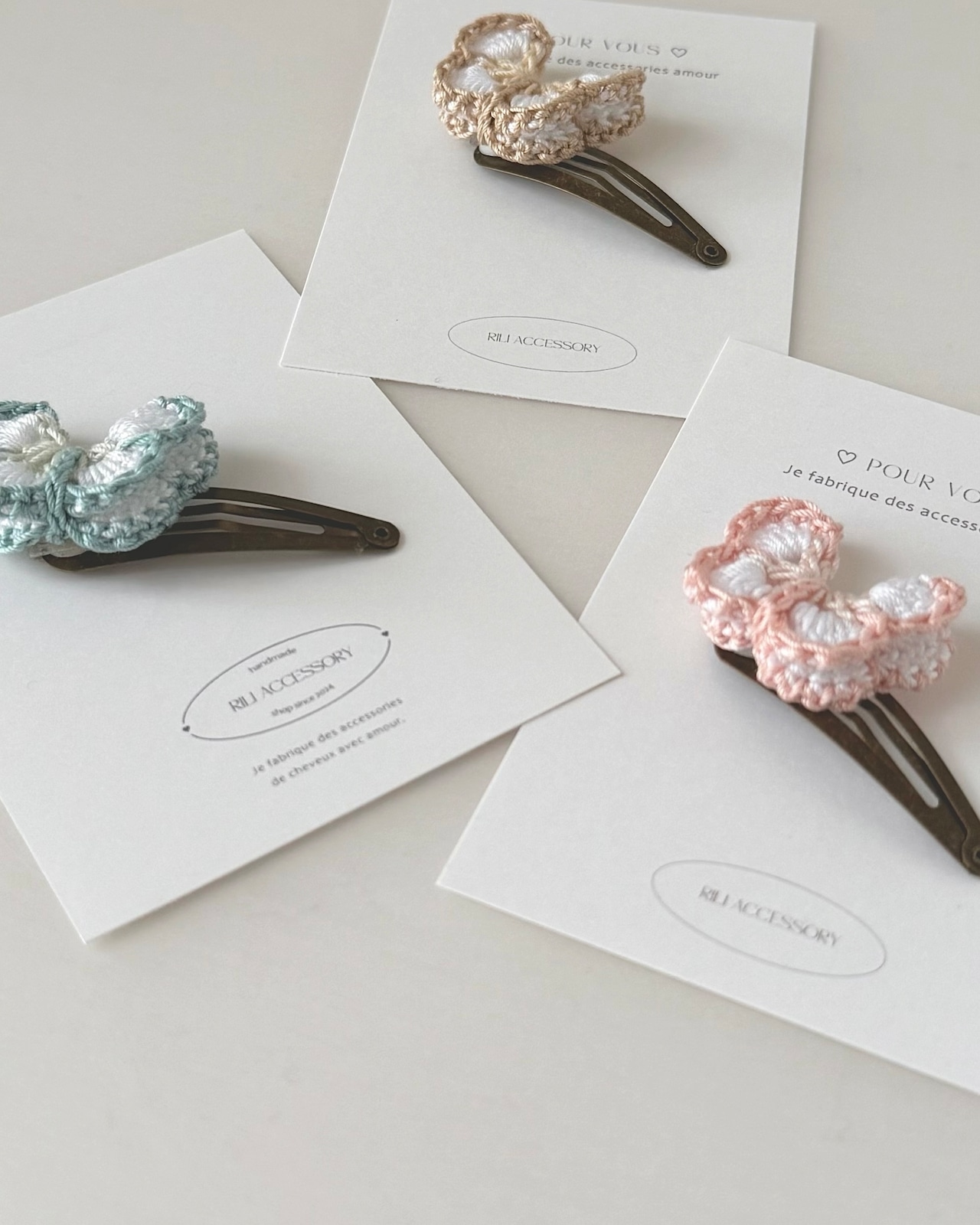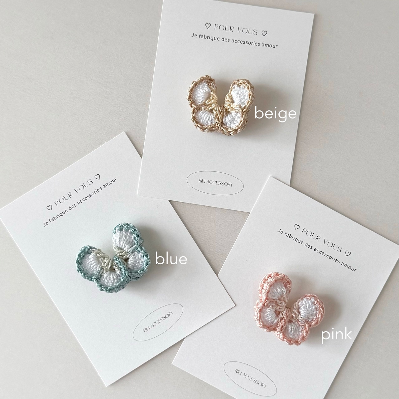 配色のバタフライクリップです。一つ一つかぎ編みで丁寧にお作りいたしました。