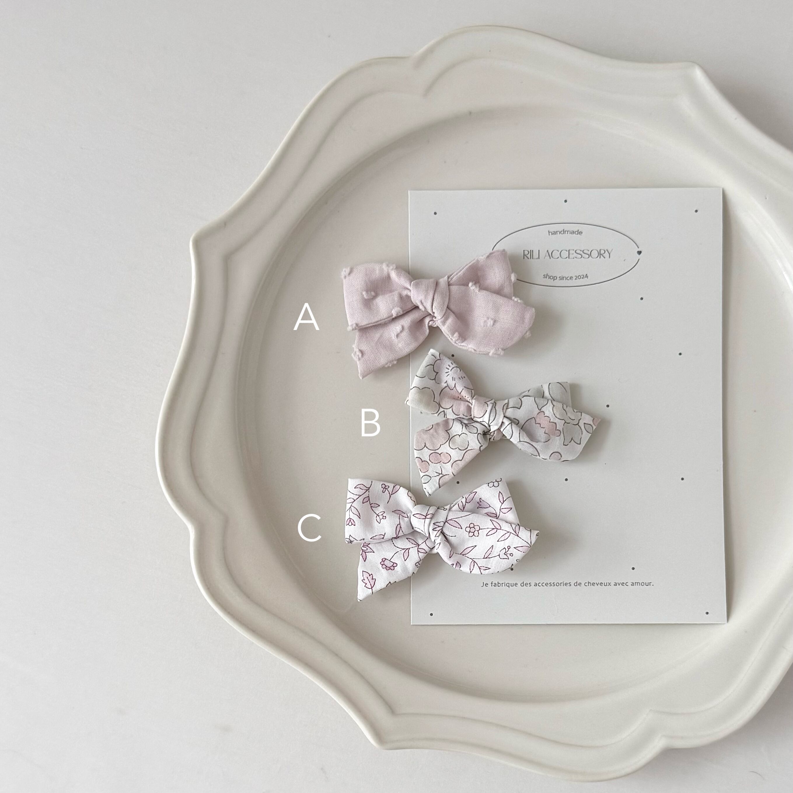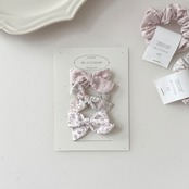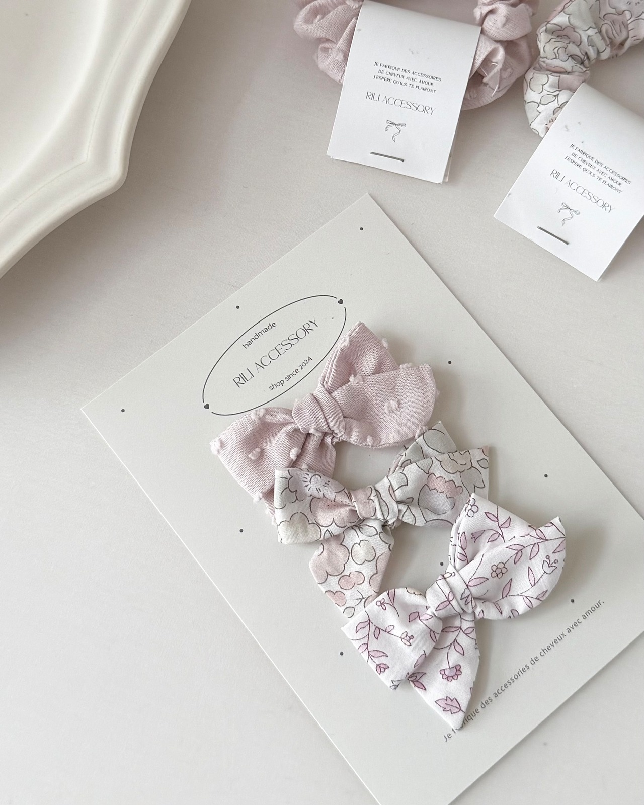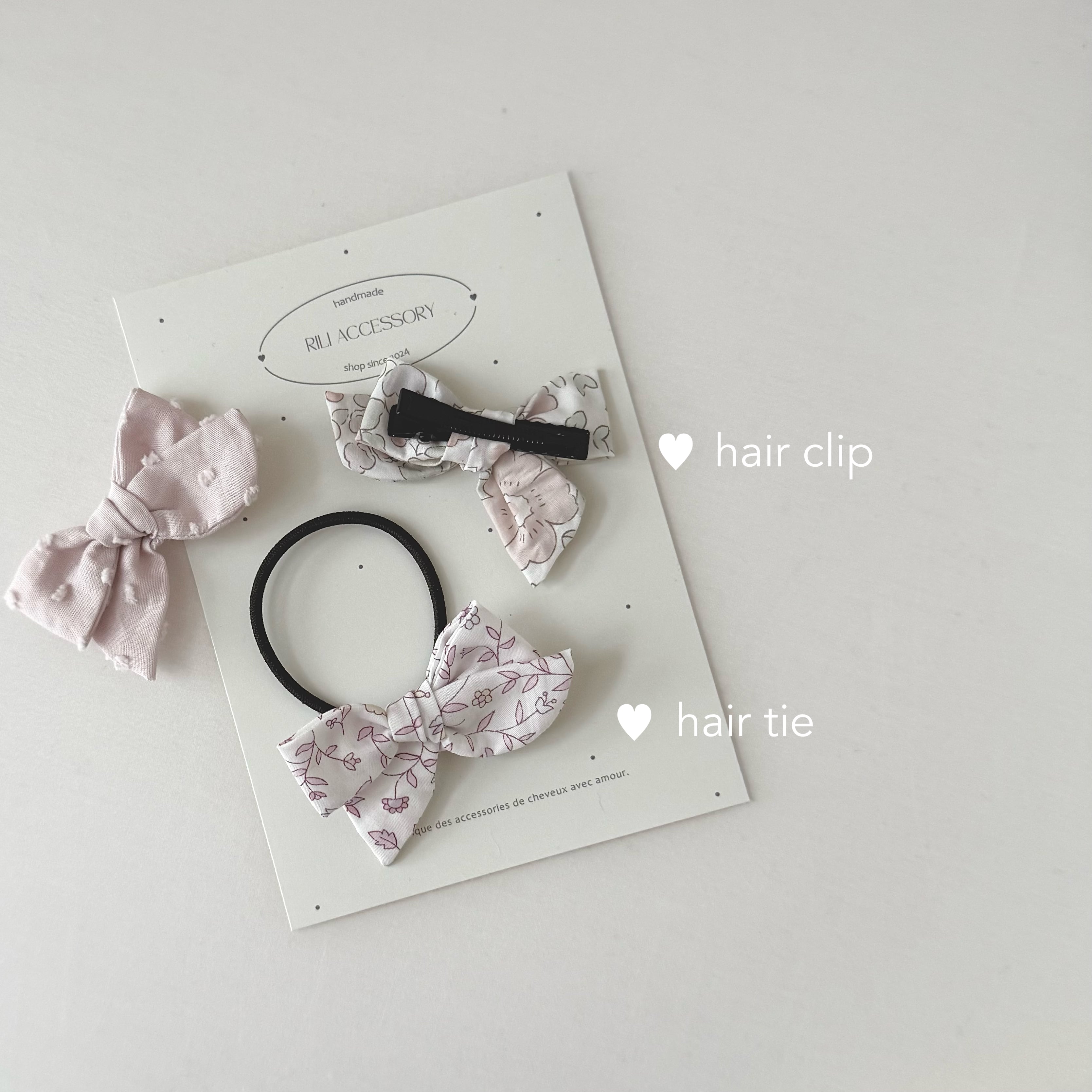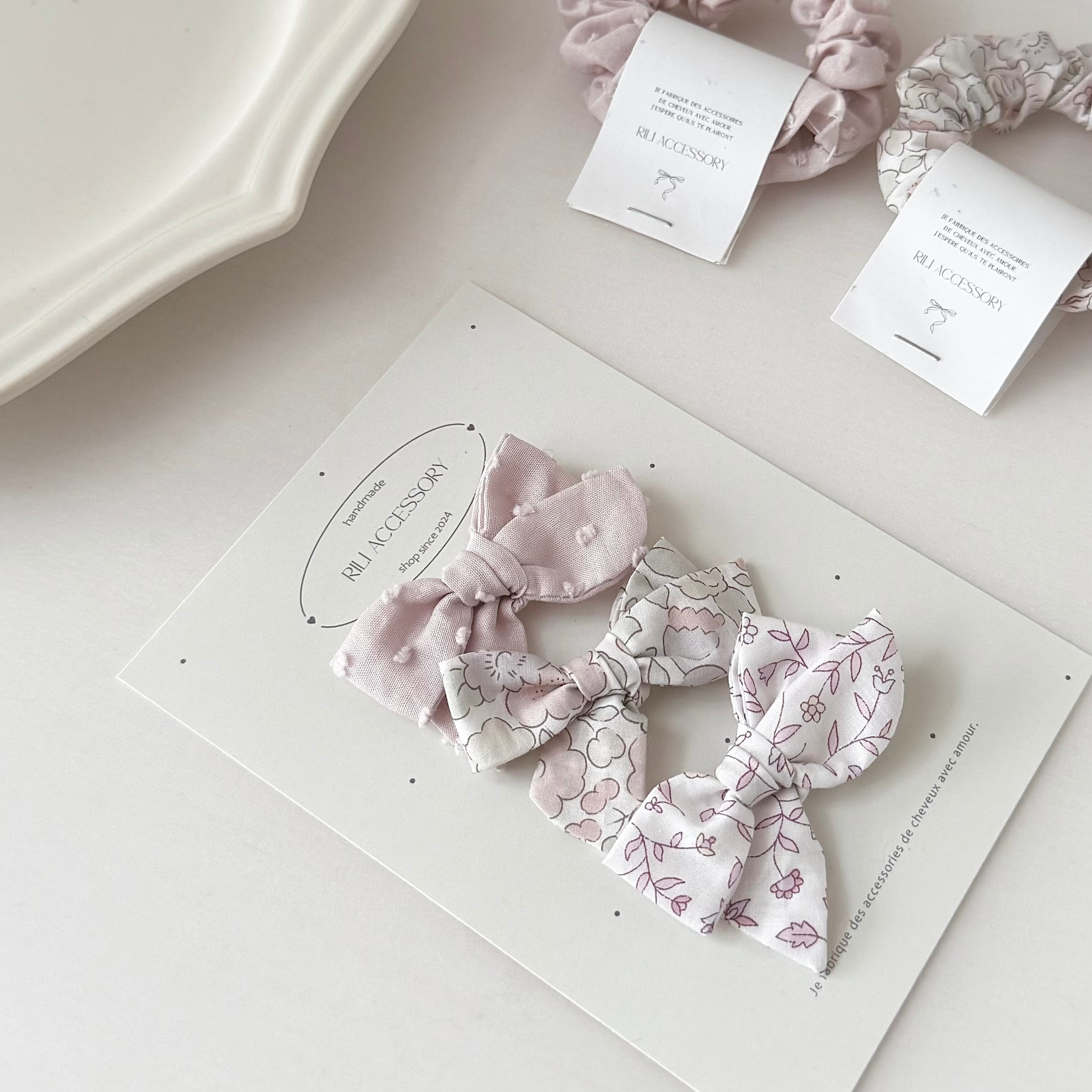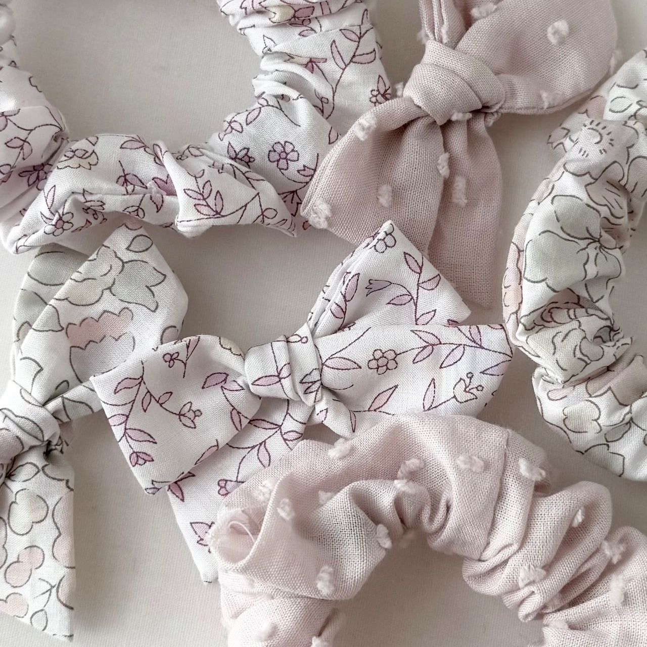 人気のリバティ、ドットミニヨンの生地で作ったシュシュです。淡いピンク系で、お子様のヘアスタイルを優しく彩ります。