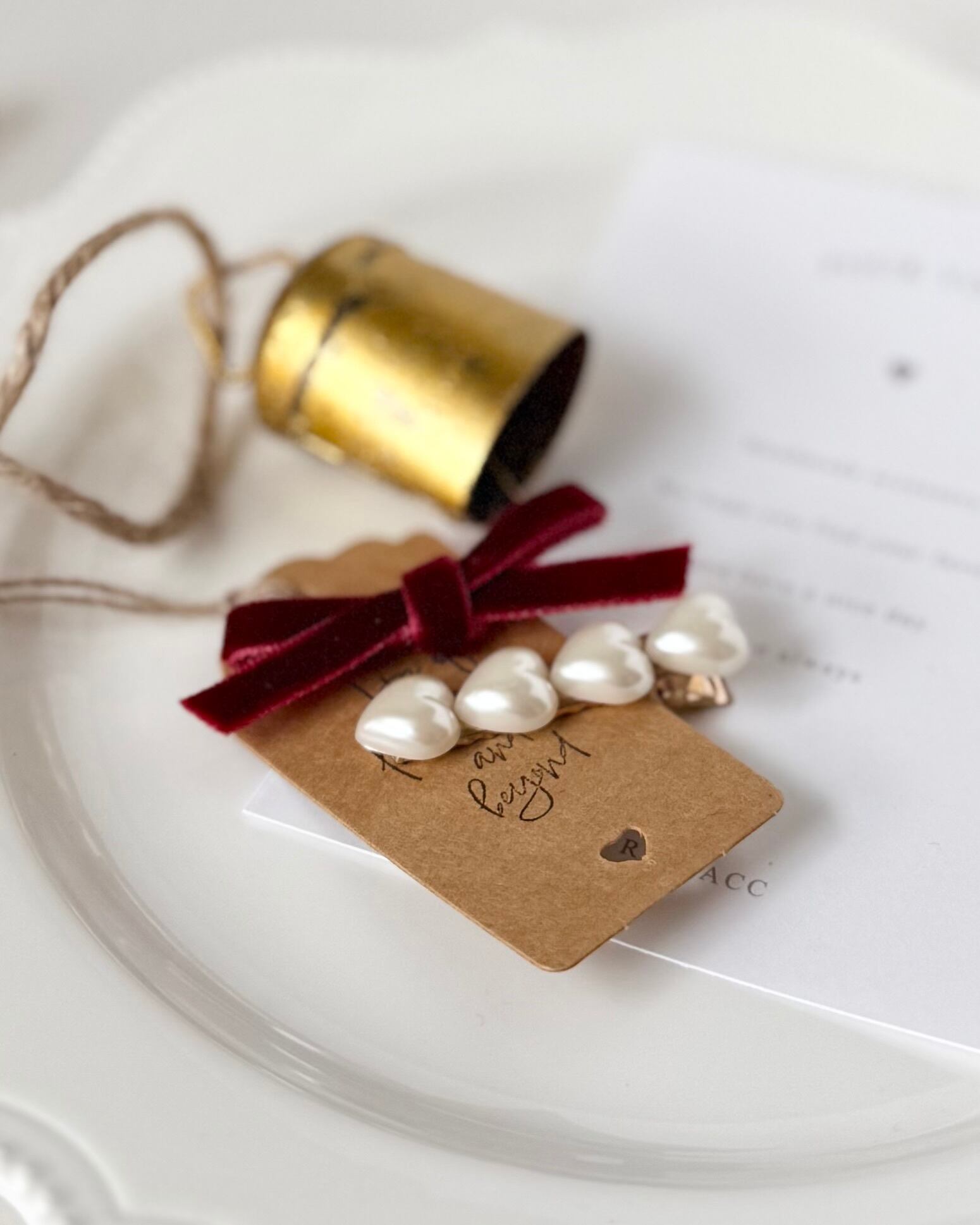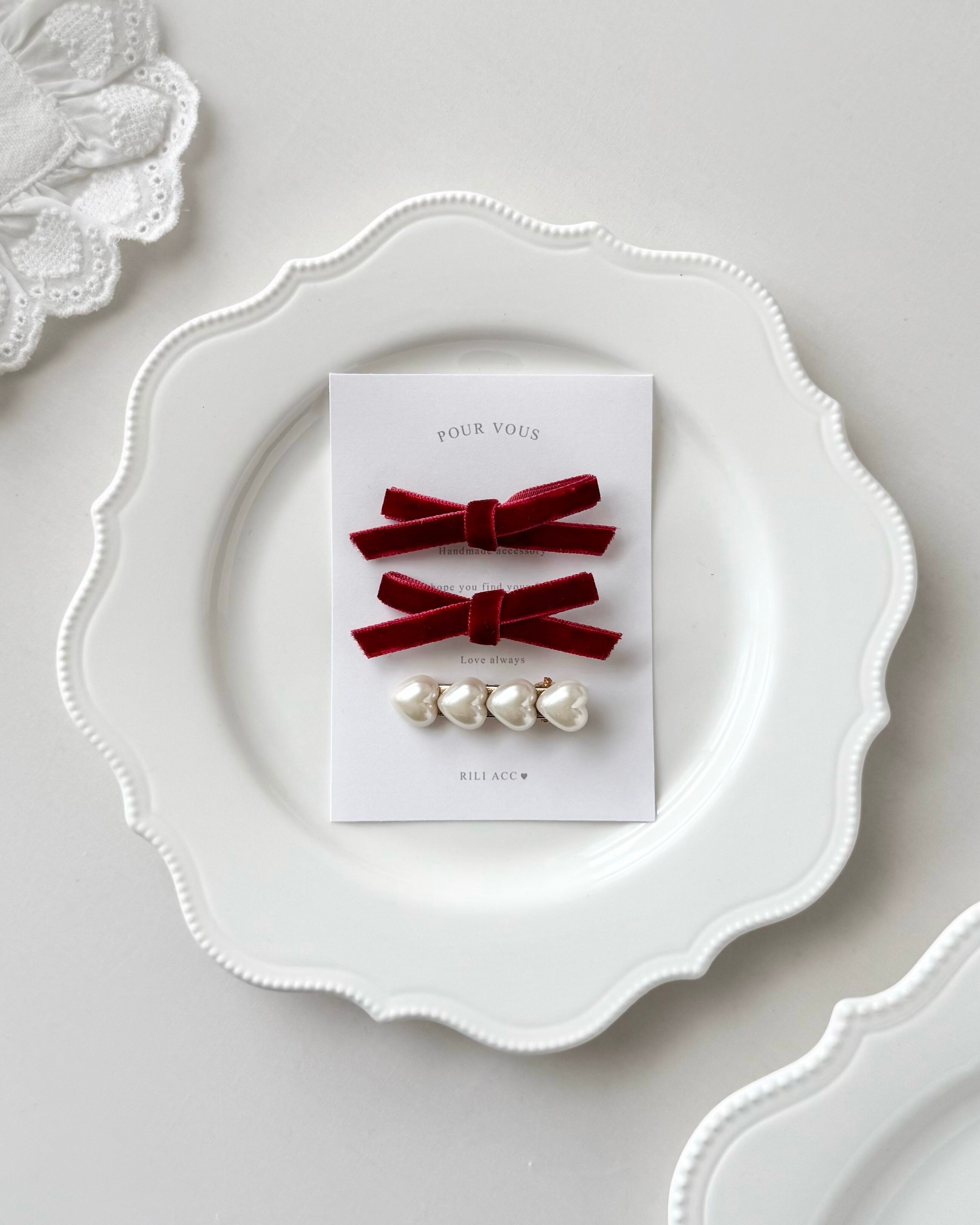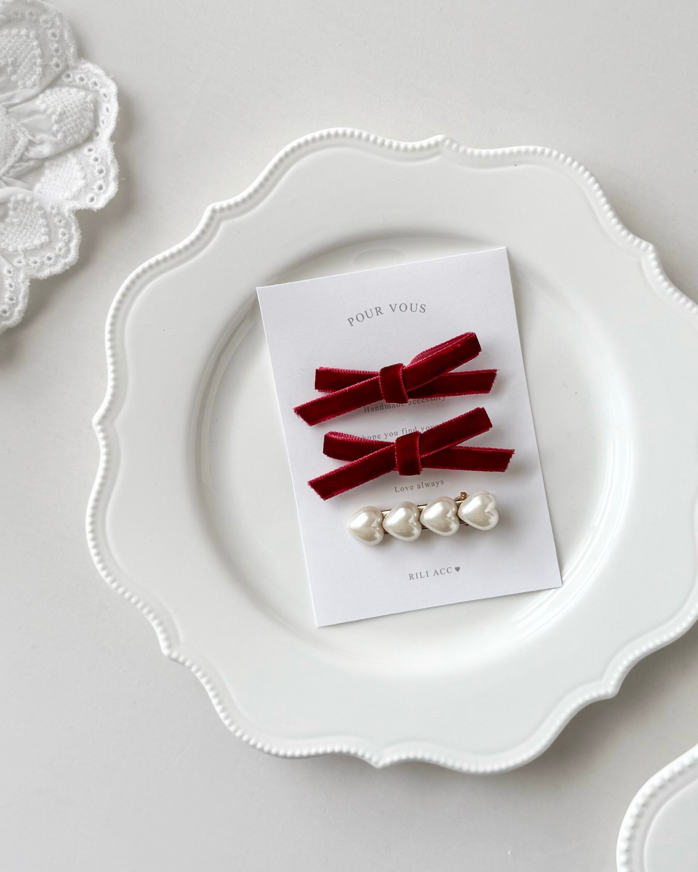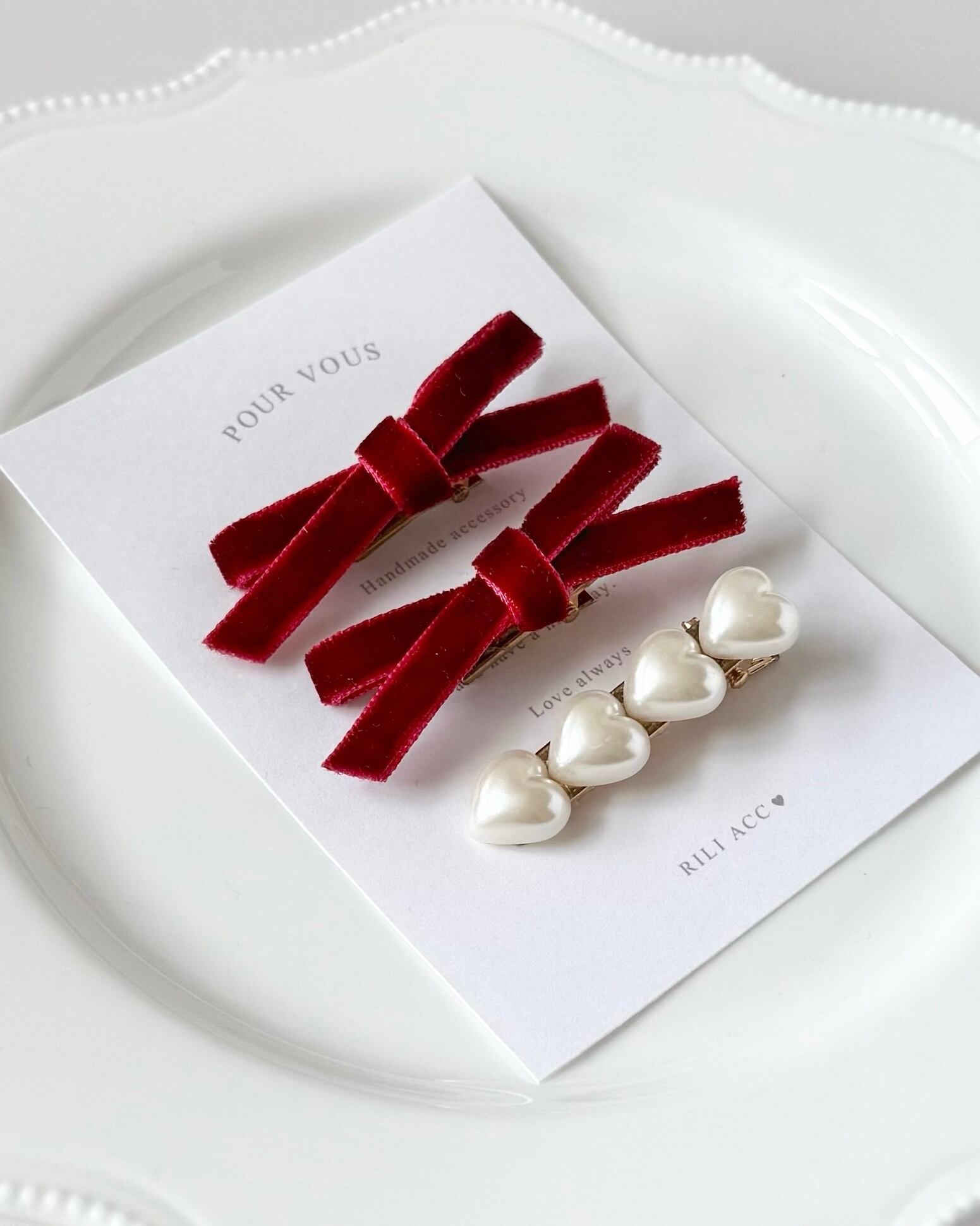 ベロアの細いリボンが可愛い、クリスマスにぴったりのヘアクリップセットです。セット使いがおすすめです。