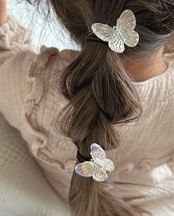 様々な服に合うクリアカラーのちょうちょのヘアクリップ です。カラーは、クリアと、角度によって虹色に輝くオーロラの2種類をご用意しました。