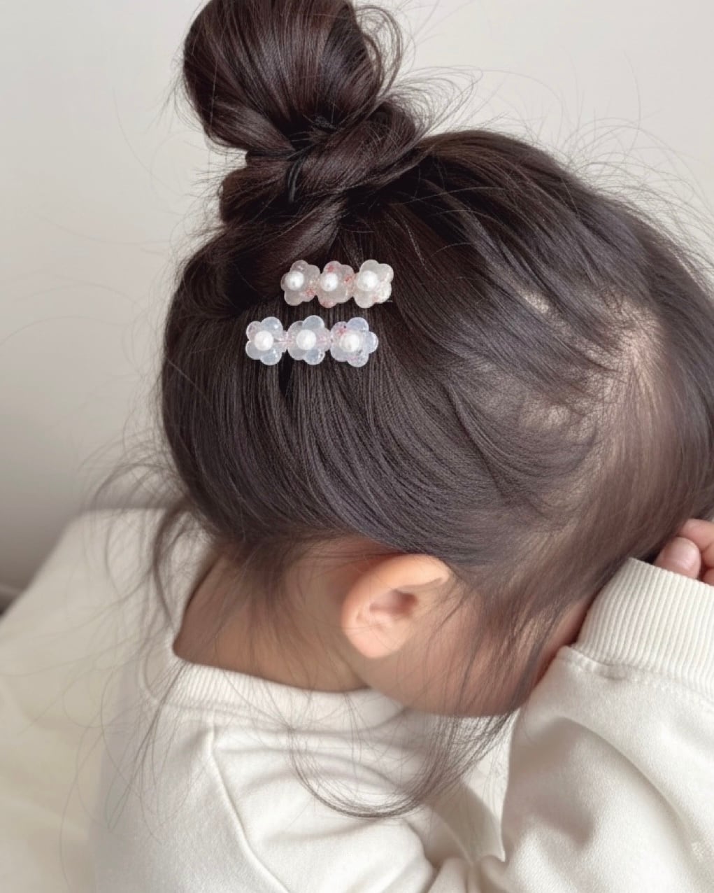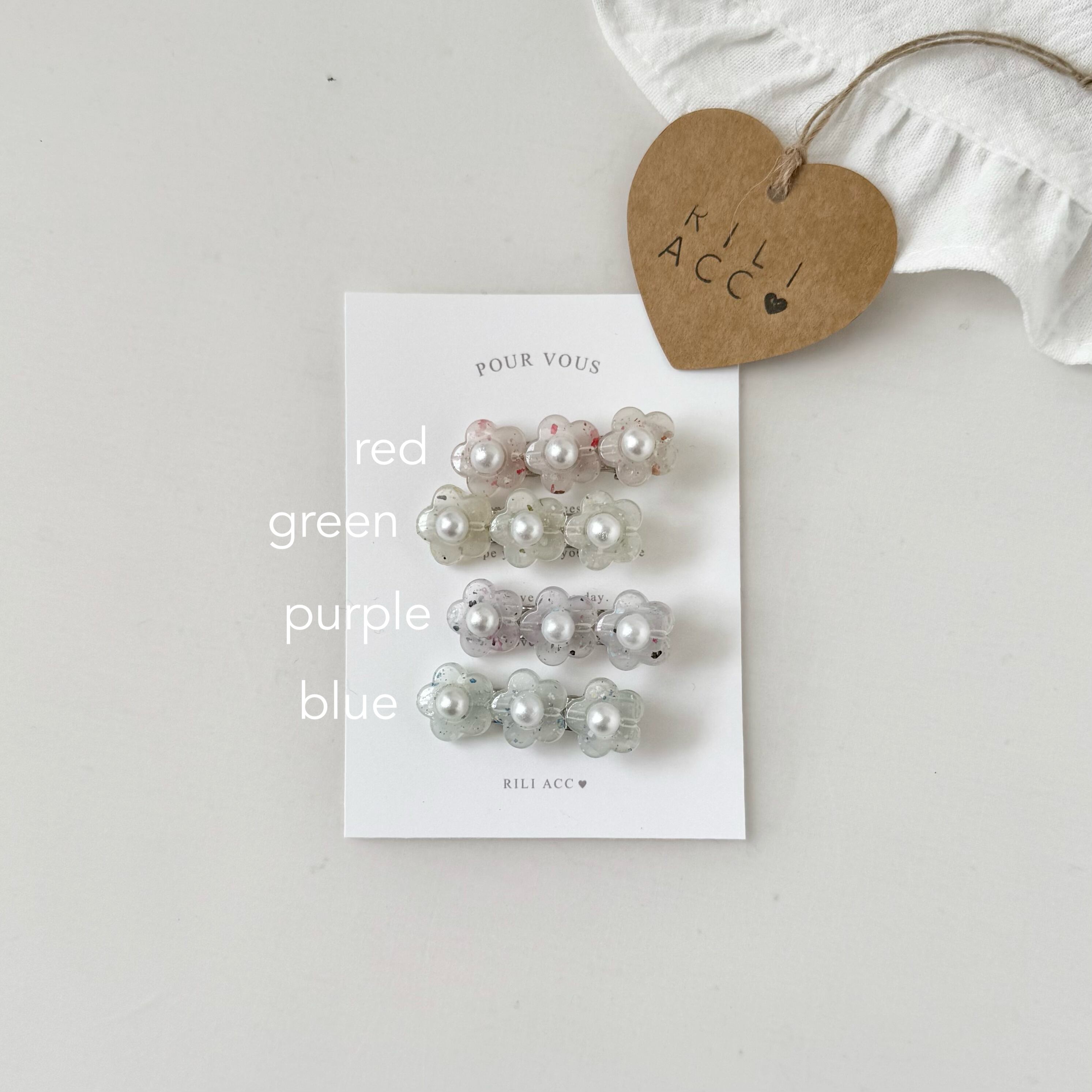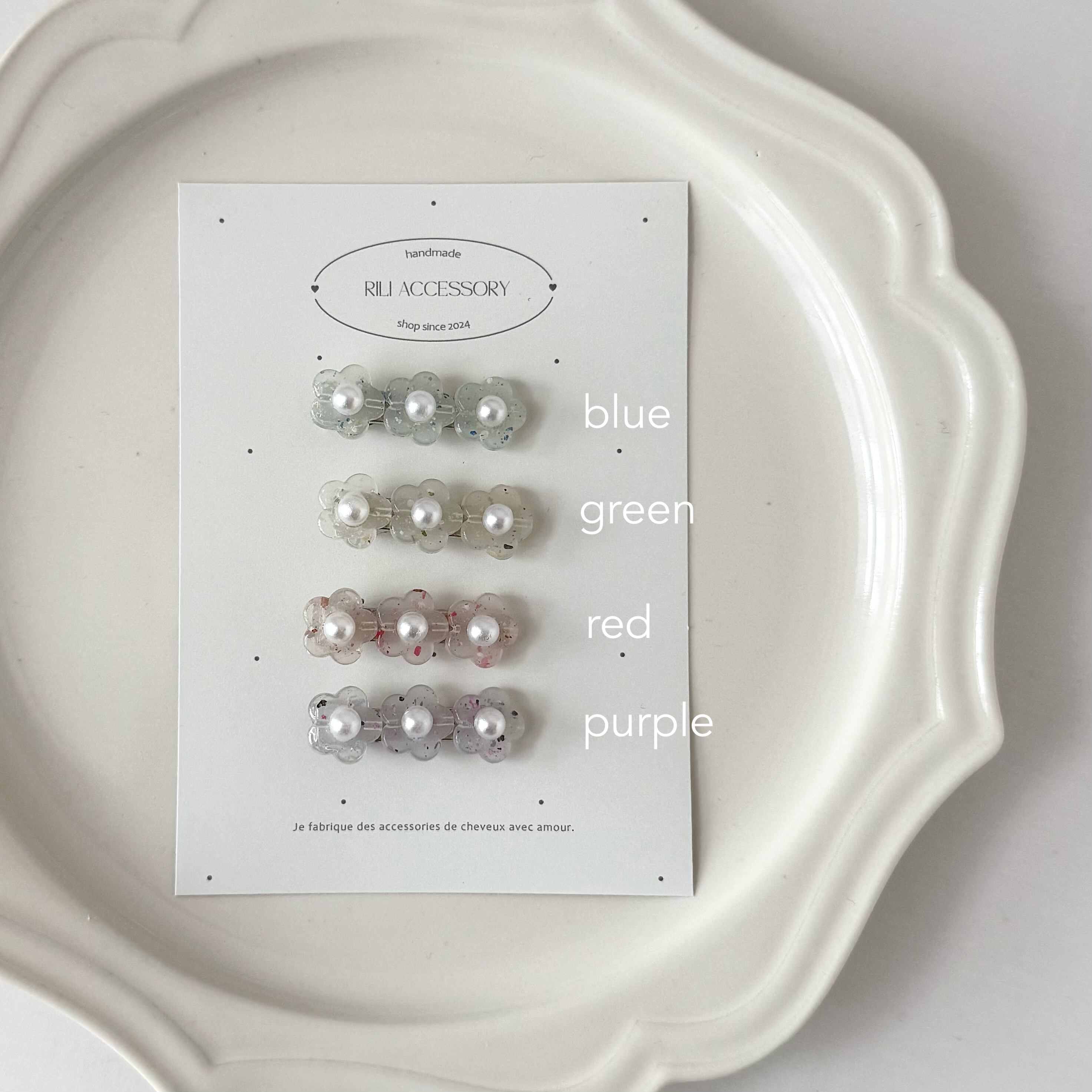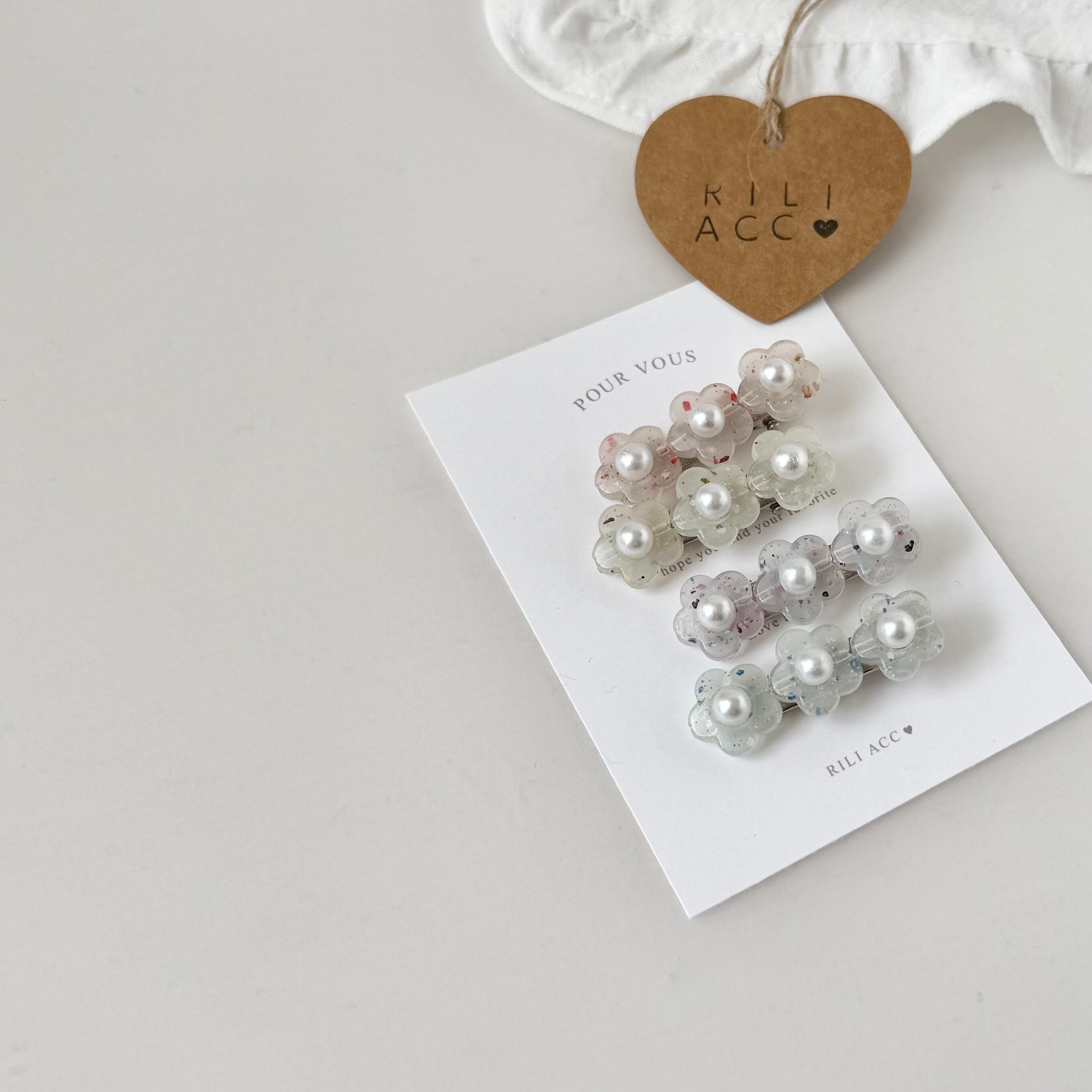 ランダムにカラーが散りばめられたお花のヘアクリップです。ニュアンスカラーで、ヘアスタイルに程よい色味をプラスします。