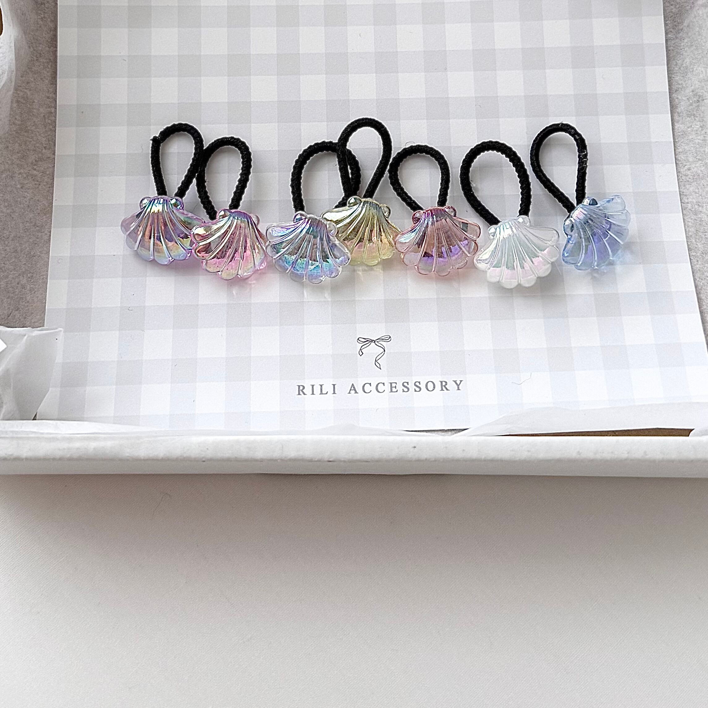 角度によってオーロラに輝くシェルのヘアクリップ /ヘアゴムです。