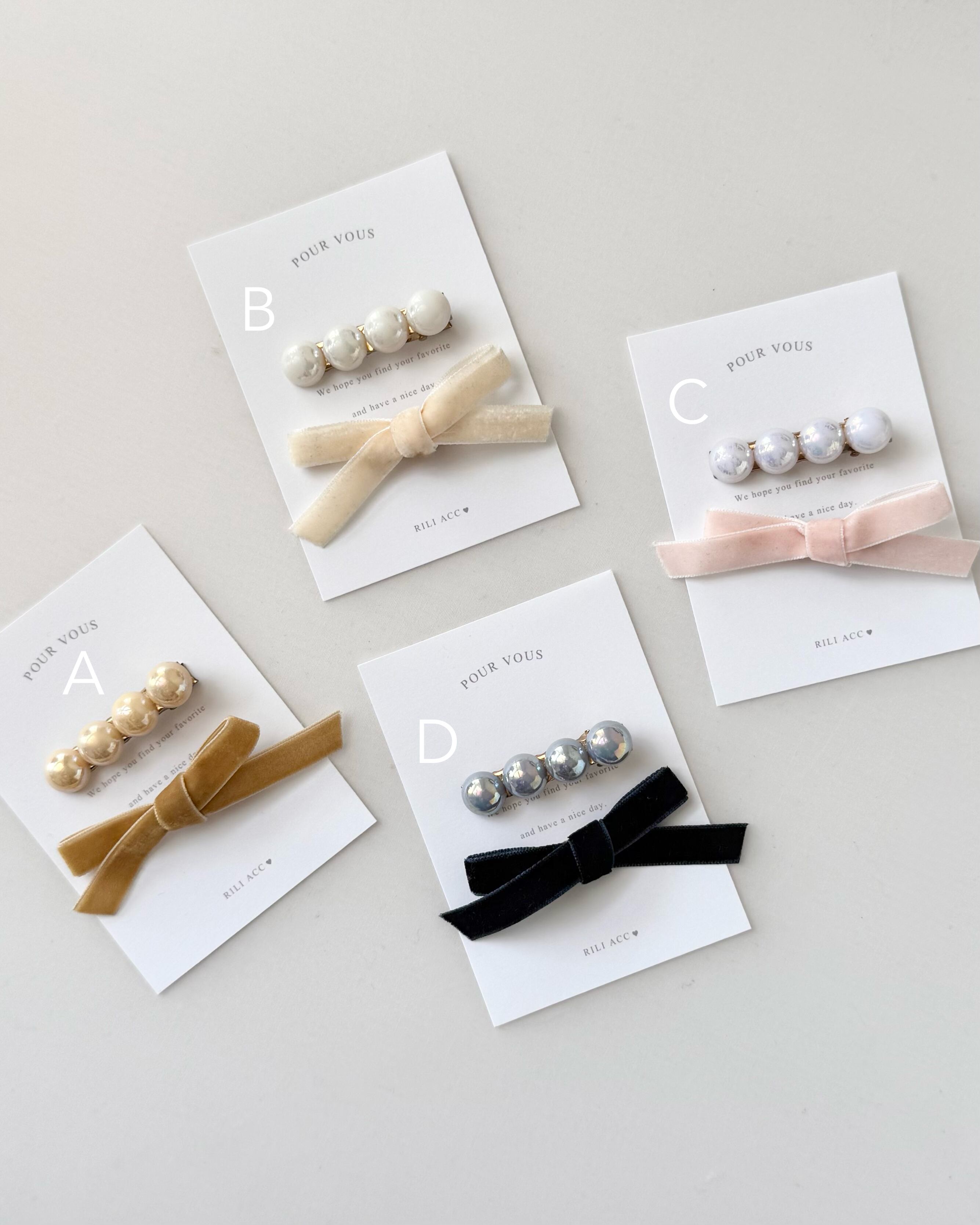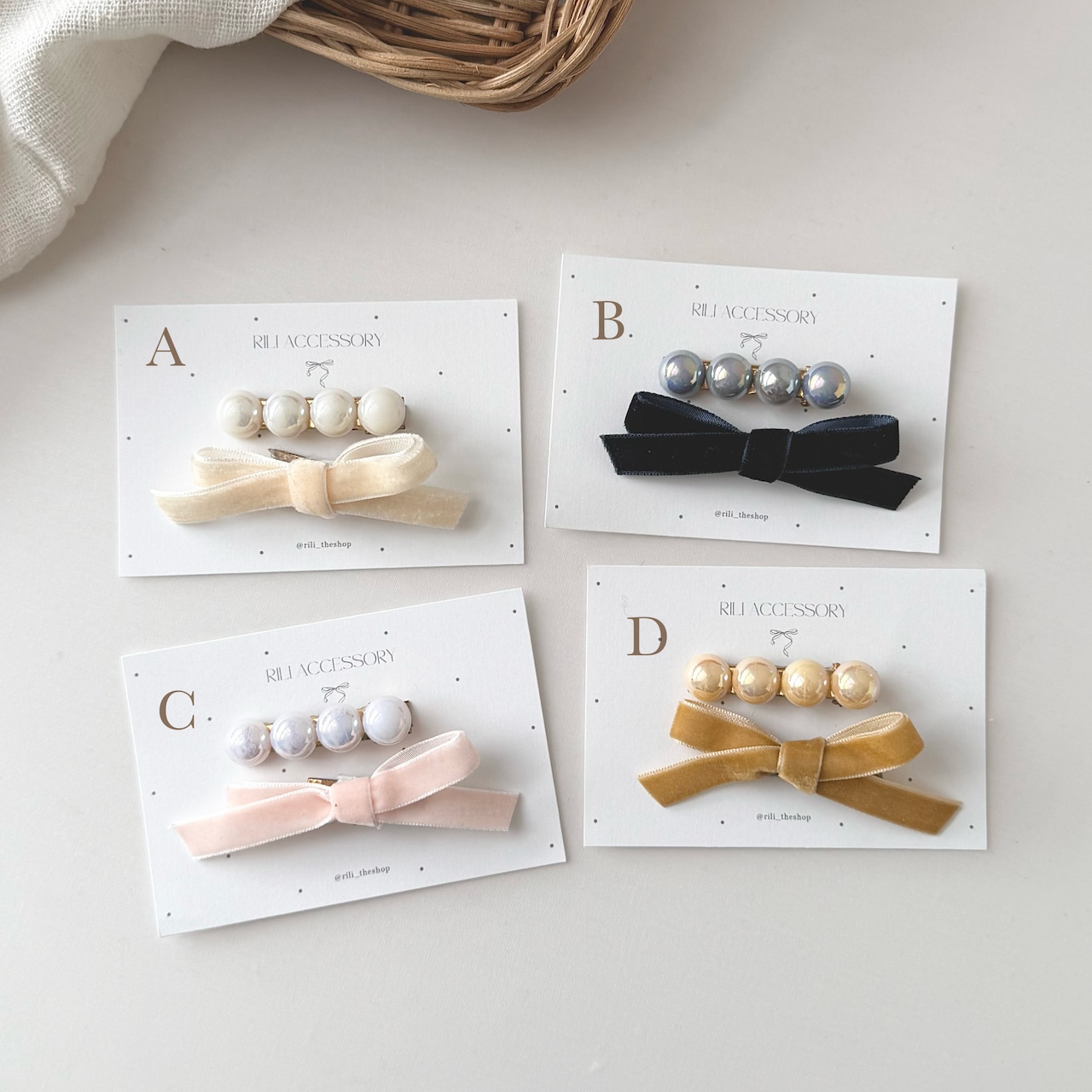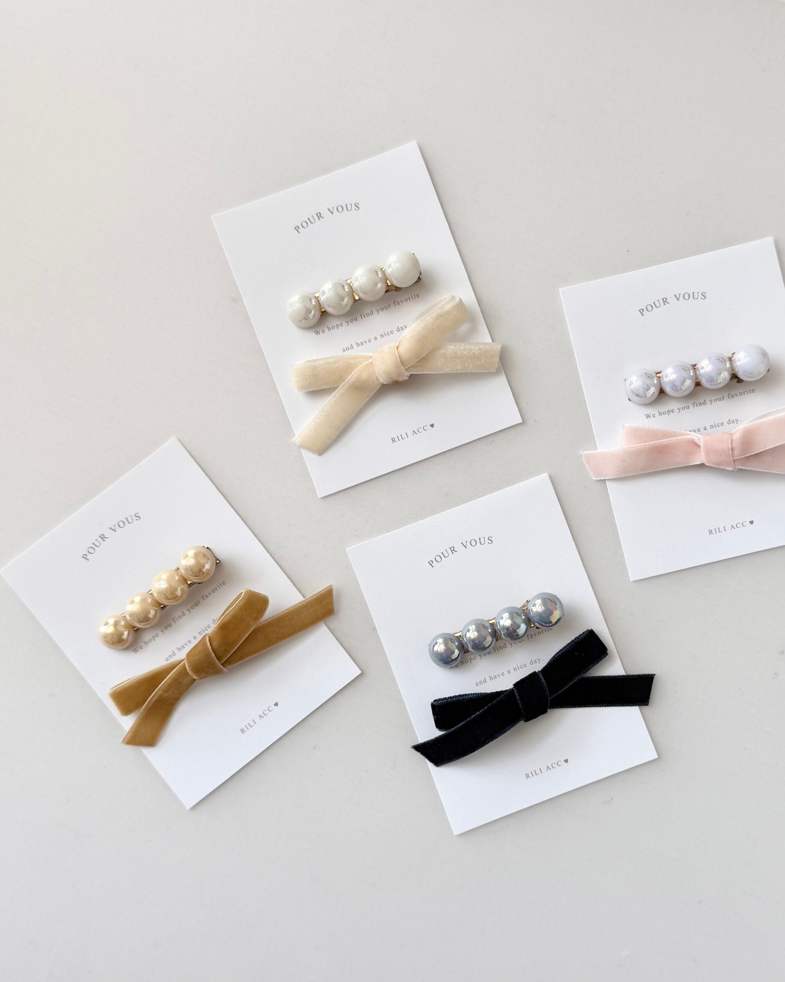 偏光パールのヘアクリップとベロアリボンクリップのセットです。それぞれ単独でつけても、重ね付けでもお使いいただきやすいデザインです♡