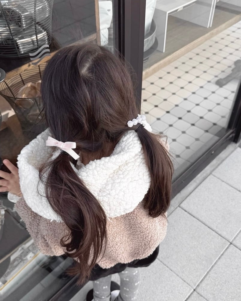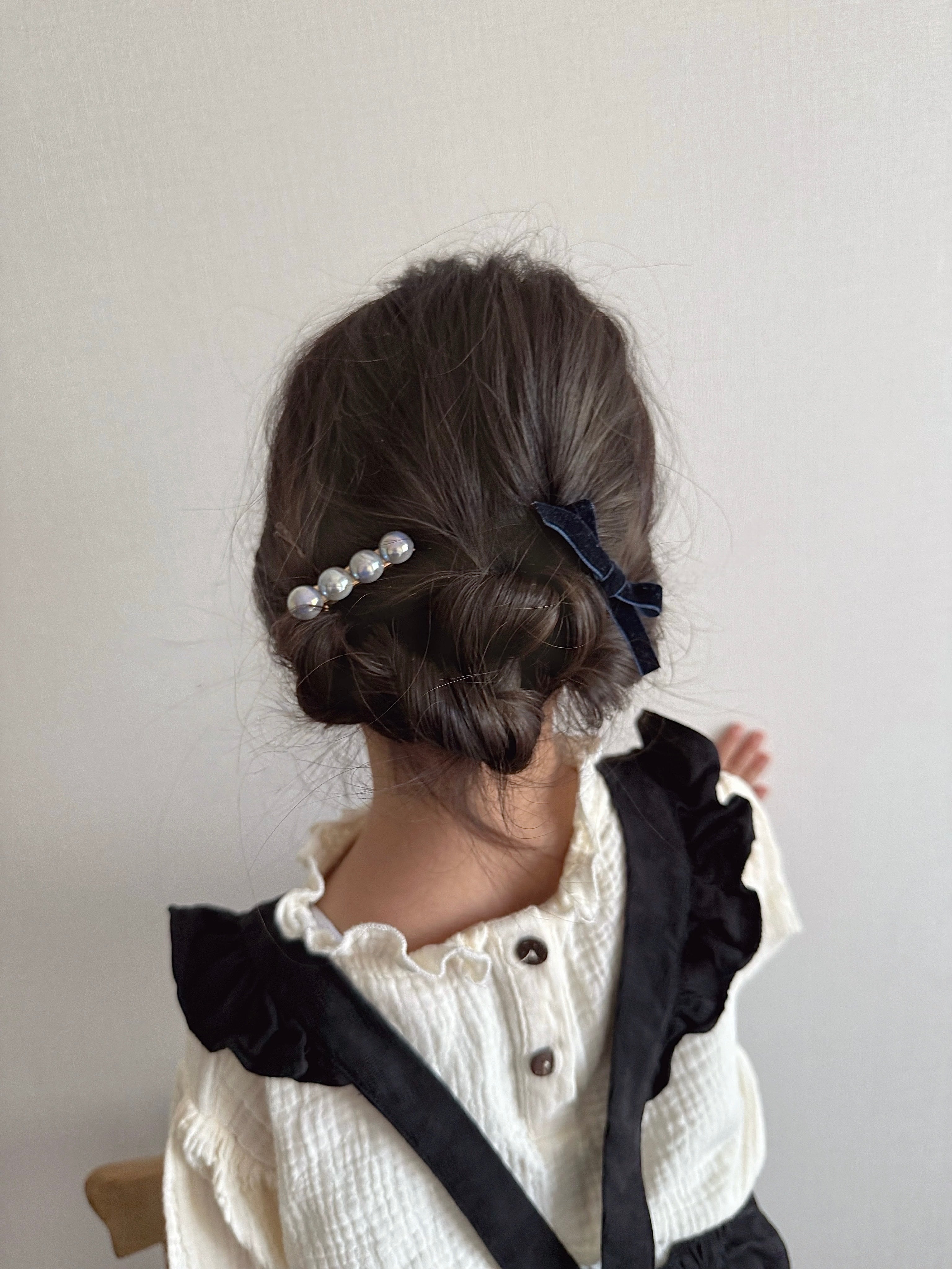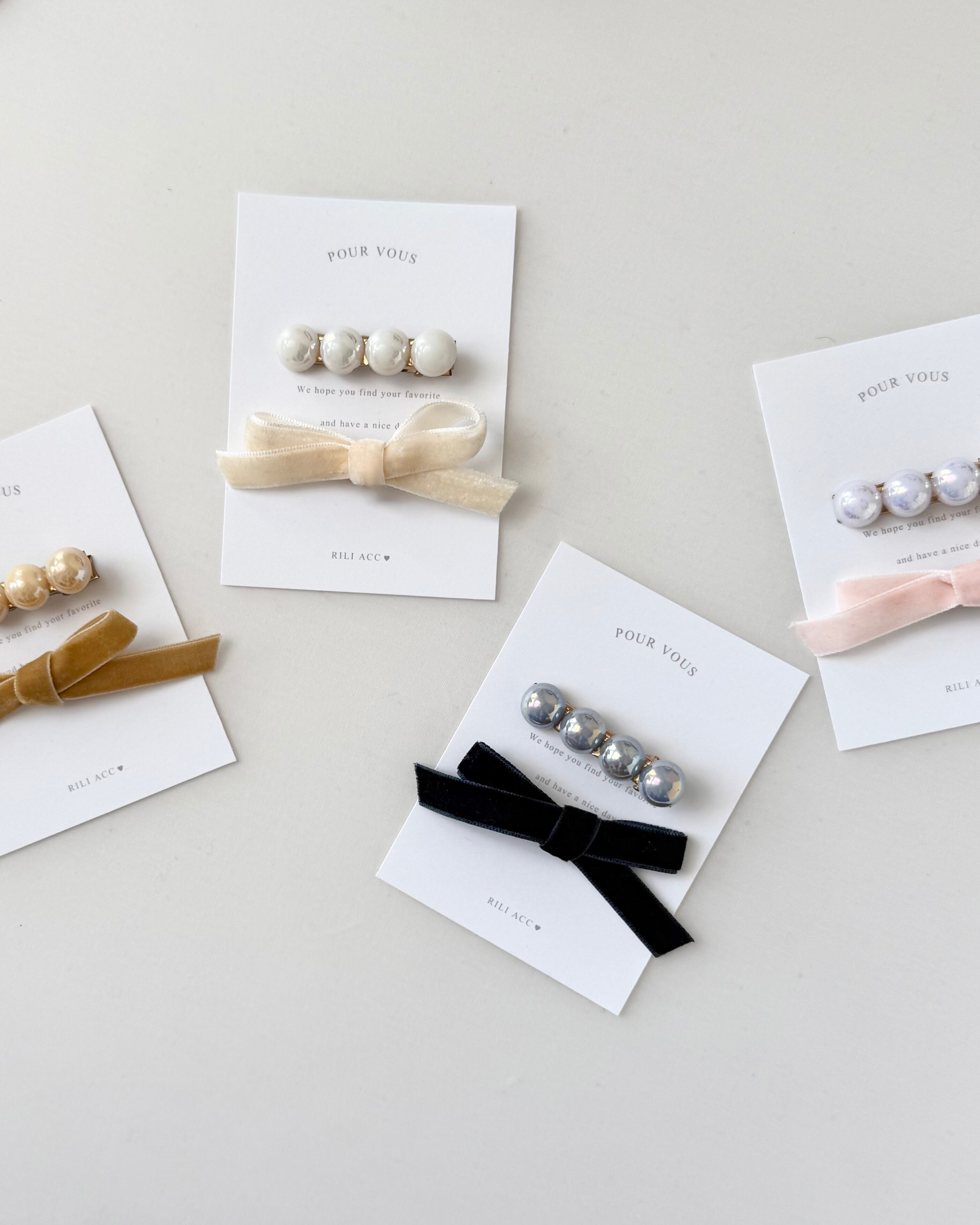 偏光パールのヘアクリップとベロアリボンクリップのセットです。それぞれ単独でつけても、重ね付けでもお使いいただきやすいデザインです♡