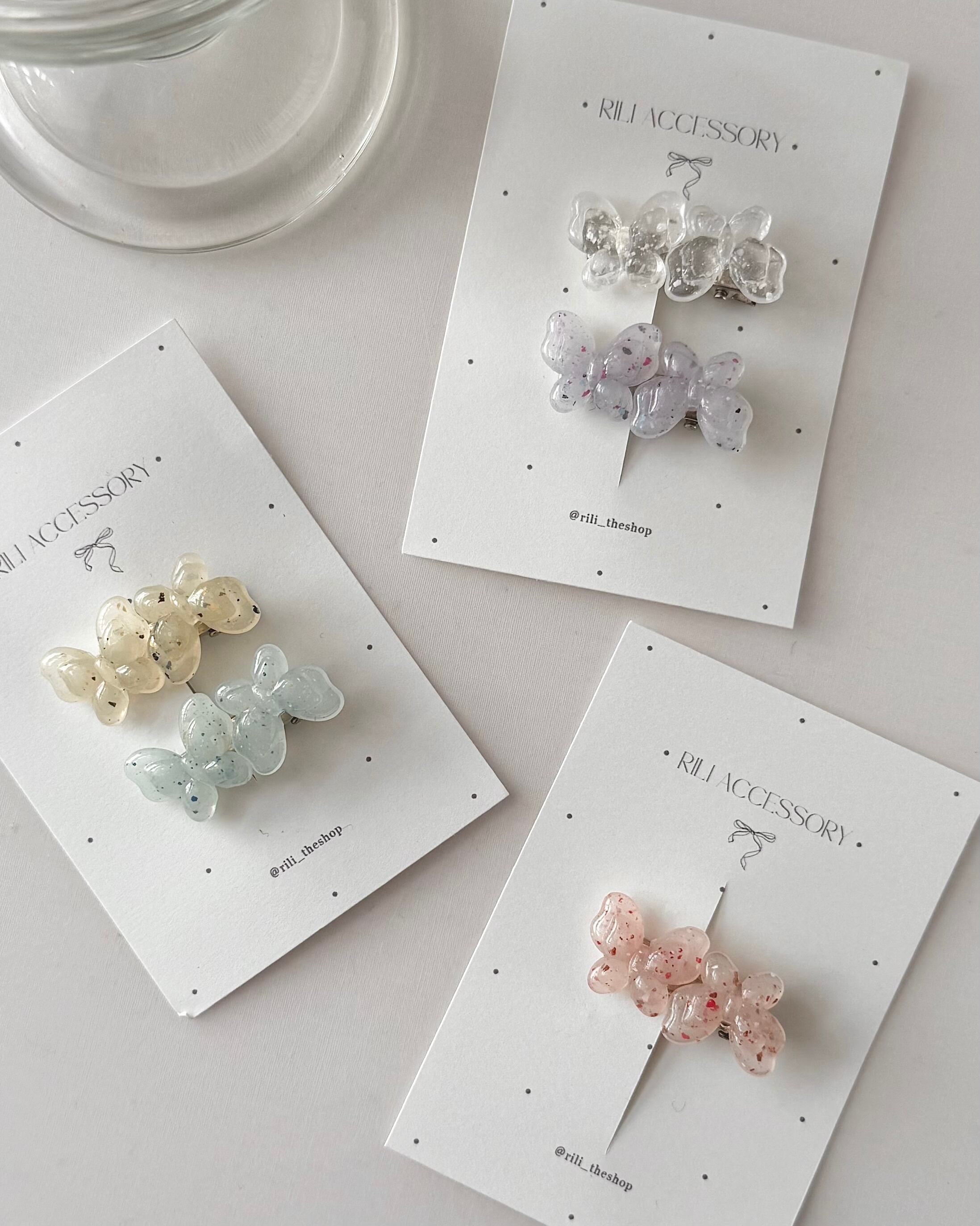 ランダムにカラーが散りばめられたちょうちょのヘアクリップです。ニュアンスカラーで、ヘアスタイルに程よい色味をプラスします。