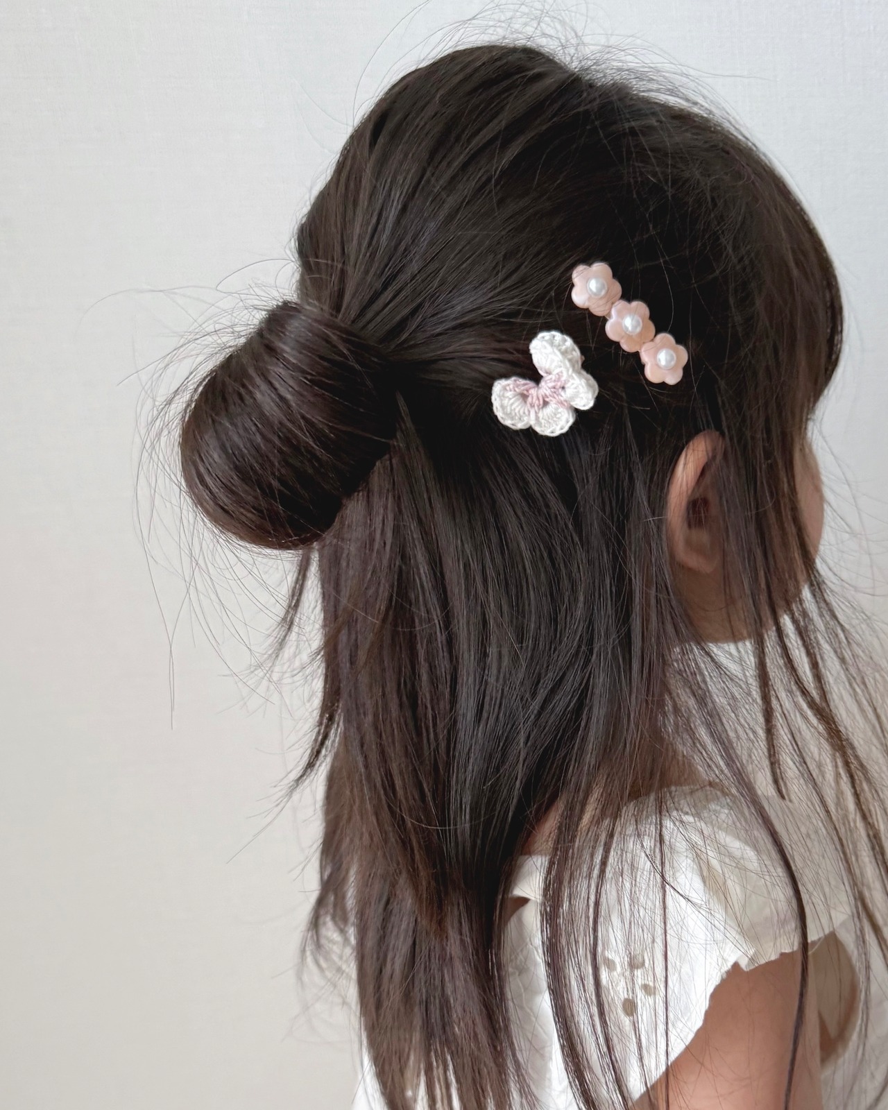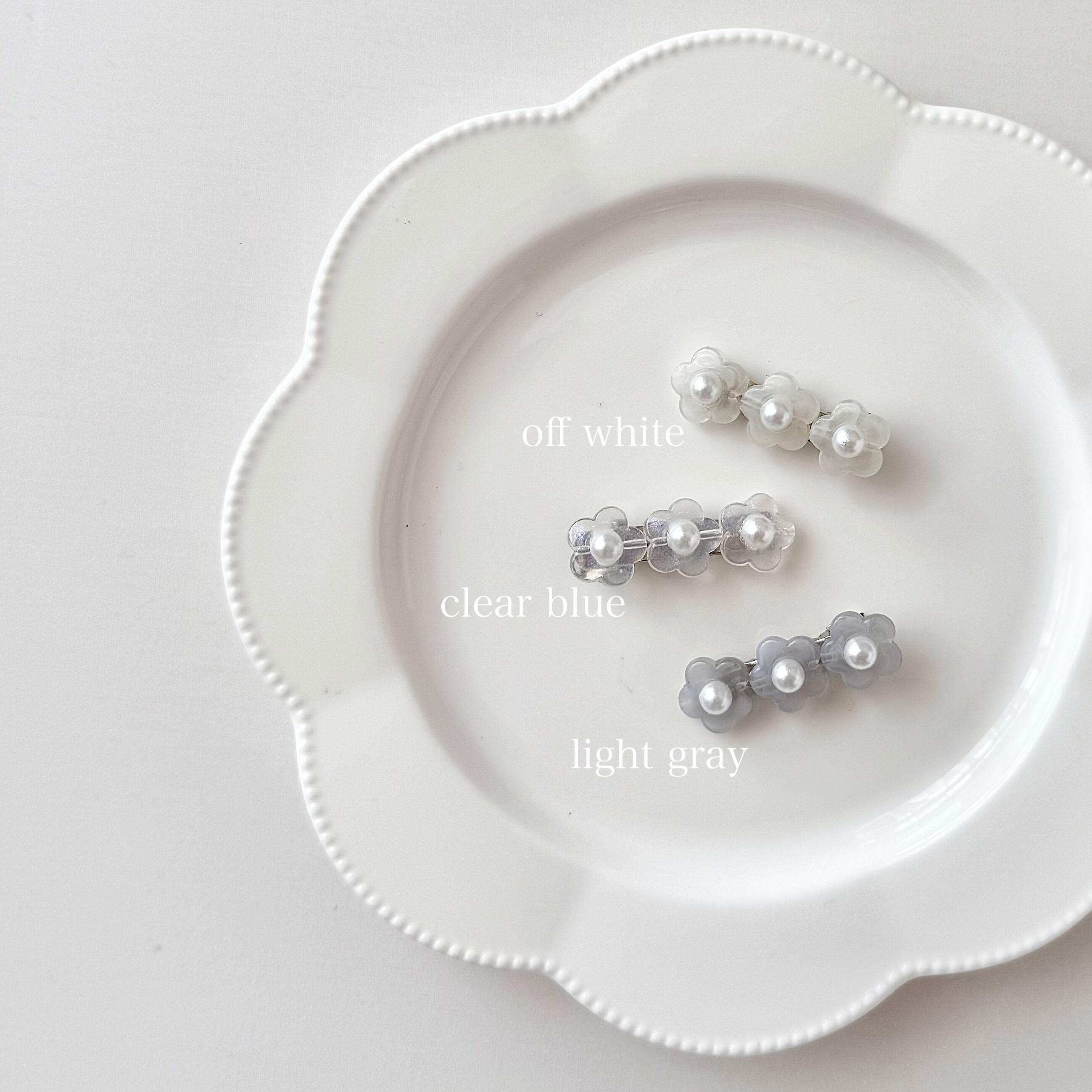 透明感のあるお花のヘアクリップです。clear blueは、黒髪に使用すると青い偏光ラメが際立ちます。