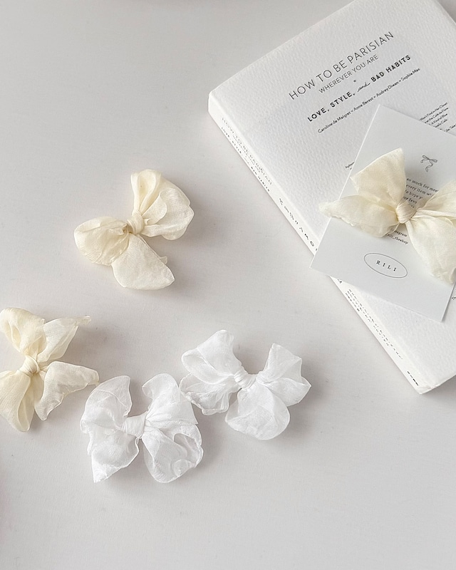 シフォン素材のリボンクリップです。お団子や三つ編みなど、様々なヘアスタイルを華やかにアレンジします。 原材料の関係上、形や大きさに個体差がございます。リボンの端を熱して加工しておりますので、シワの出方に個体差がございますが、良品とさせていただいております。 ※お使いの端末や設定等により実物と写真の色味や質感が異なって見えることがあります。 ******************************************* 〈セット内容〉 表示価格は1つあたりのものです。 〈サイズ〉 リボン…約6〜7cm (cream約5〜6cm) クリップ…3.5cm モデル…3歳 〈素材〉 リボン…ポリエステル ヘアクリップ…合金